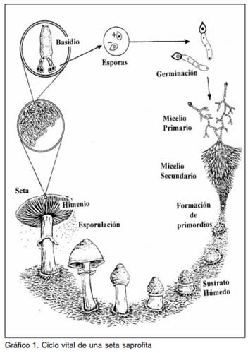 Ciclo vital de una seta saprofita (Agaricales)BasidiosporaHifaMicelio Primario (n)Unión (Plamogamia)Micelio Secundario (n+n)OrganizaciónMicelio Terciario (Basidiocarpo) o SetaFecundación (Cariogamia)MeiosisFormación de Basidiosporas