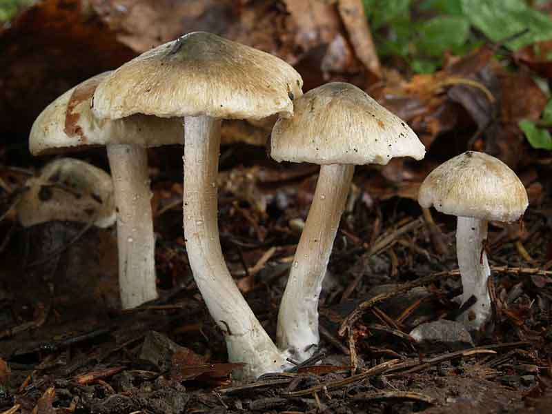 - Descripción: Es un pequeño hongo micorrízico con un capuchón cónico a convexo que se vuelve plano en edad y con frecuencia es fibrinoso cerca del margen. Por lo general, mide menos de 5 cm de ancho, tiene un umbo romo ligeramente más oscuro y un margen curvo cuando es joven. El color de la tapa varía de beige a marrón amarillo claro, generalmente con manchas verdosas que desaparecen cuando se seca el hongo. Las branquias son adnatas a casi libres, numerosas, de color marrón pálido, café grisáceo o marrón tabaco. El cuerpo de la fruta tiene tonos verdosos y moretones azules donde se dañaron. Las esporas son lisas y elipsoides, midiendo 6-9.5 x 4.5 micrómetros y formando una impresión de espora marrón arcilla. El tallo mide 2-7 cm de largo, 3 a 8 mm de espesor, y tiene el mismo ancho en toda la longitud, a veces con algo de hinchazón en la base. Es sólido, gris pálido, se vuelve verde azulado de abajo hacia arriba. El tallo es fibroso y parece estar cubierto con polvo fino cerca de la parte superior. Tiene un velo parcial que a menudo desaparece con la edad y un desagradable olor a jabón.