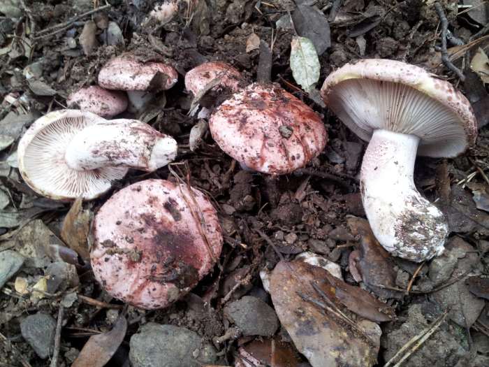 • Las láminas son gruesas y espaciadas, a menudo un poco decurrentes, de color blanco o rosado manchado irregularmente de púrpura, como el resto del carpóforo, sobre todo en los ejemplares más viejos.
